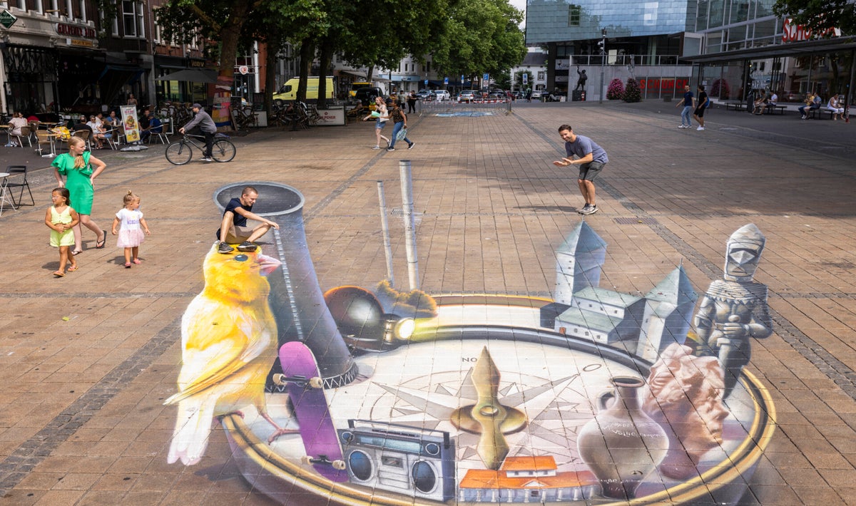 9. Twee Floorals. De floorals die Stefan Thelen, alias Super A, heeft ontworpen blikten terug naar het verleden van Heerlen én gaven een kijkje in de toekomstplannen. De eerste flooral was een kompas, die wees naar de windrichtingen in de stad waar elementen uit de verschillende tijdperken te vinden zijn: de Romeinse tijd, Landsfort Herle (de Middeleeuwen), de Mijnperiode en het heden. Met de tweede flooral werd vooruitgeblikt naar de toekomstplannen van de gemeente voor de Promenade en de Bongerd, middels water- en groenelementen met 3D-effect. De floorals waren tijdelijk te zien.